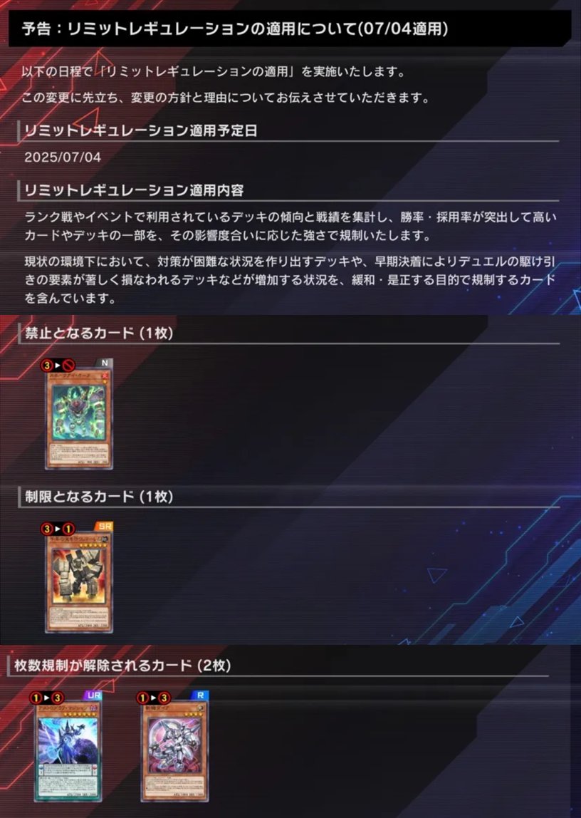 2025.6.24 マスターデュエル リミットレギュレーション 9期 1701環境 から変更されたカード。