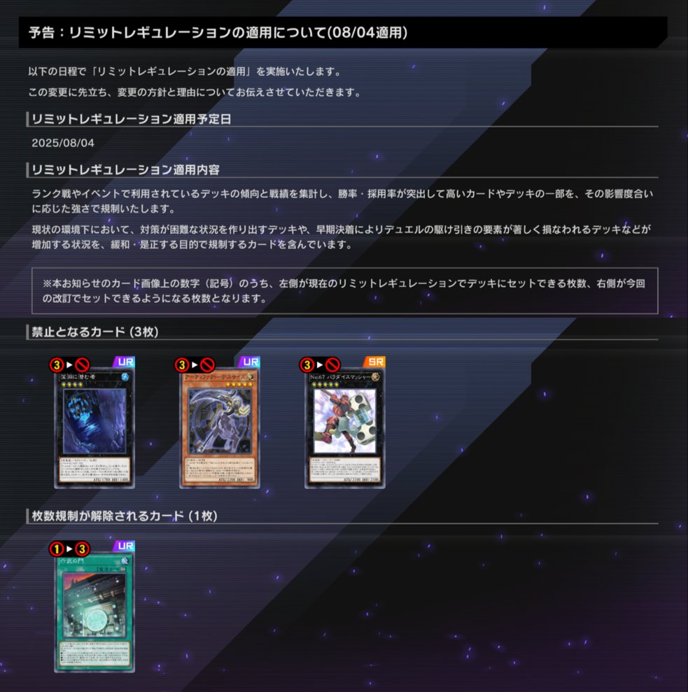 2025.3.6 マスターデュエル リミットレギュレーション 8期 1402環境 から変更されたカード。