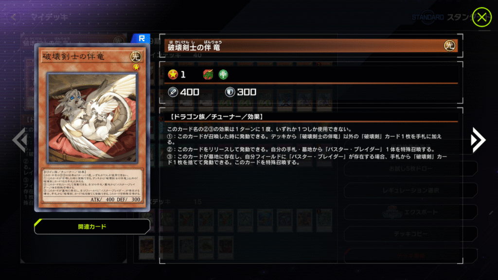 このカード名の②③の効果は1ターンに1度、いずれか1つしか使用できない。①:このカードが召喚に成功した時に発動できる。デッキから「破壊剣士の伴竜」以外の「破壊剣」カード1枚を手札に加える。②:このカードをリリースして発動できる。自分の手札・墓地から「バスター・ブレイダー」1体を選んで特殊召喚する。③:このカードが墓地に存在し、自分フィールドに「バスター・ブレイダー」が存在する場合、手札から「破壊剣」カード1枚を捨てて発動できる。このカードを特殊召喚する。