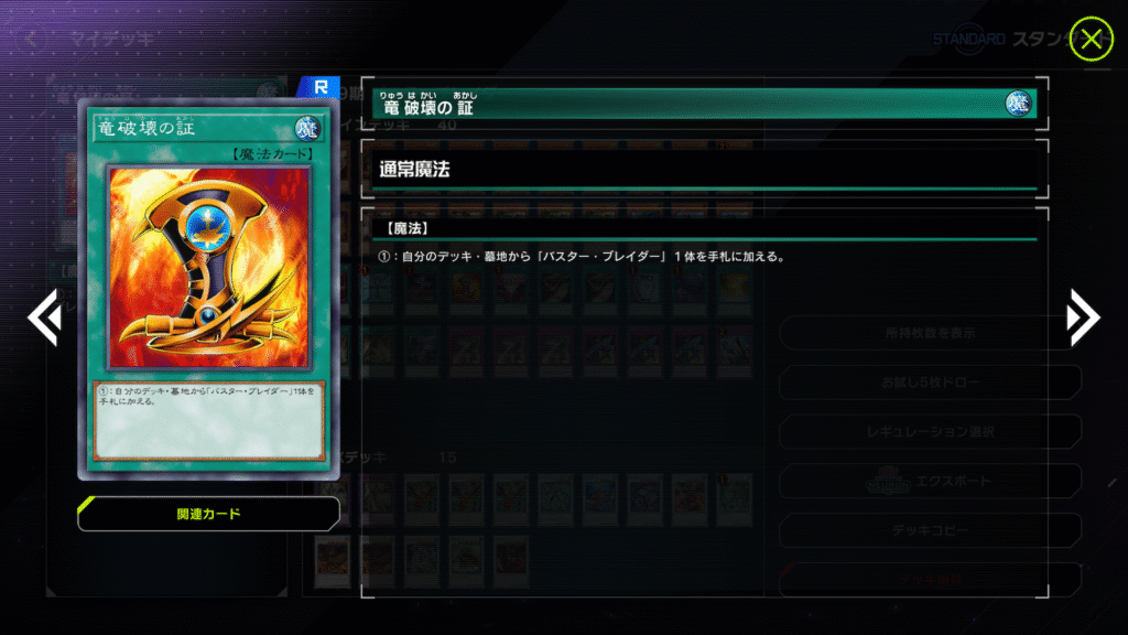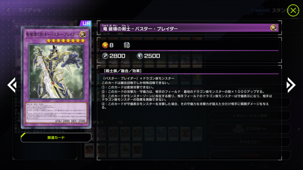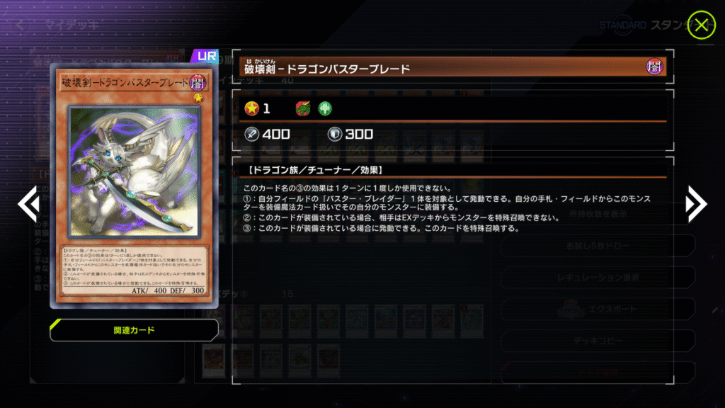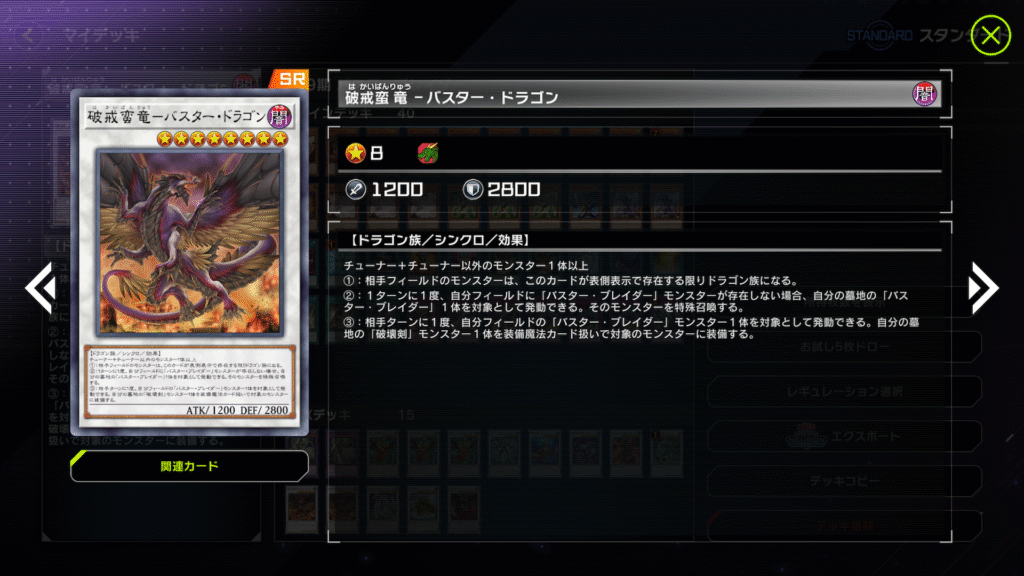 ①:相手フィールドのモンスターは、このカードが表側表示で存在する限りドラゴン族になる。②:自分フィールドに「バスター・ブレイダー」モンスターが存在しない場合、1ターンに1度、自分の墓地の「バスター・ブレイダー」1体を対象として発動できる。そのモンスターを特殊召喚する。③:相手ターンに1度、自分フィールドの「バスター・ブレイダー」モンスター1体を対象として発動できる。自分の墓地の「破壊剣」モンスター1体を装備カード扱いとして対象のモンスターに装備する。