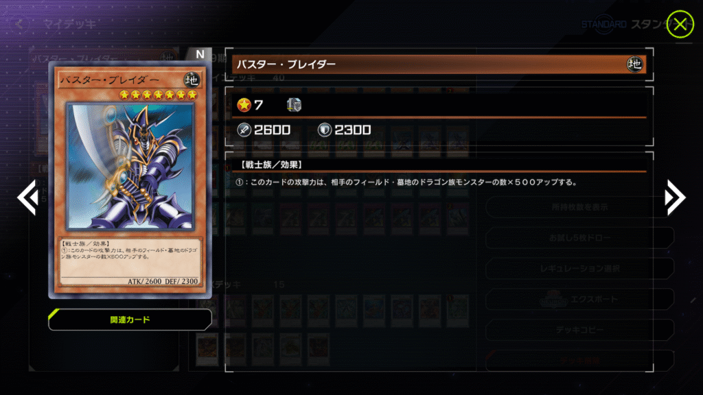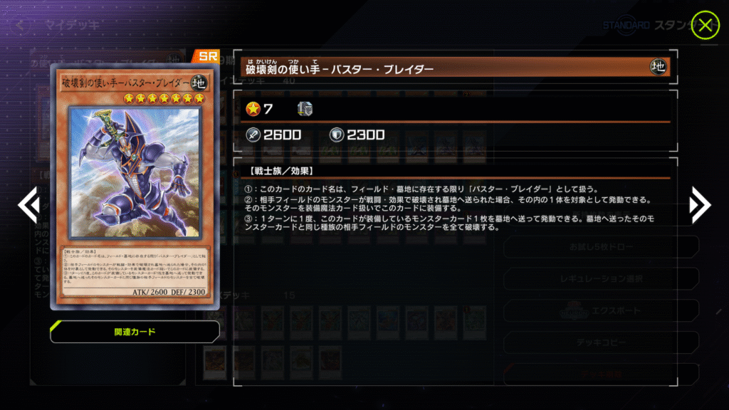 ①:このカードのカード名は、フィールド・墓地に存在する限り「バスター・ブレイダー」として扱う。②:相手フィールドのモンスターが戦闘・効果で破壊され墓地へ送られた場合、破壊されたそのモンスター1体を対象として発動できる。そのモンスターを装備カード扱いとしてこのカードに装備する。③:1ターンに1度、このカードが装備しているモンスターカード1枚を墓地へ送って発動できる。墓地へ送ったそのモンスターカードと同じ種族の相手フィールドのモンスターを全て破壊する。