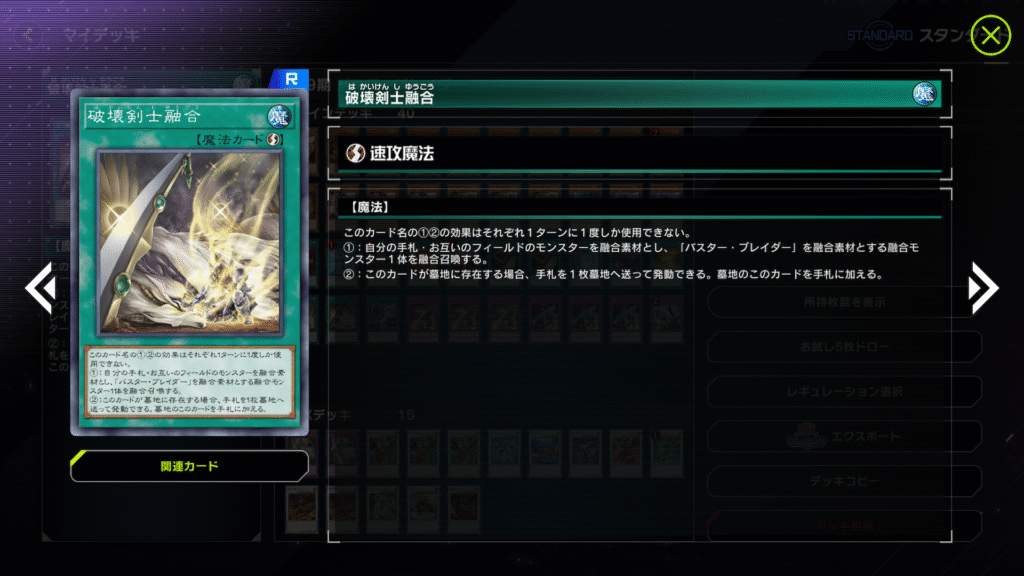 「破壊剣士融合」の①②の効果はそれぞれ1ターンに1度しか使用できない。①:自分の手札及び自分・相手フィールドから、融合モンスターカードによって決められた融合素材モンスターを墓地へ送り、「バスター・ブレイダー」を融合素材とするその融合モンスター1体をエクストラデッキから融合召喚する。②:このカードが墓地に存在する場合、手札を1枚墓地へ送って発動できる。墓地のこのカードを手札に加える。