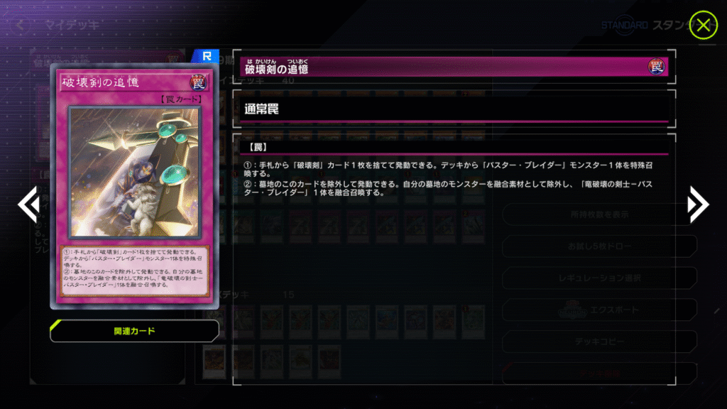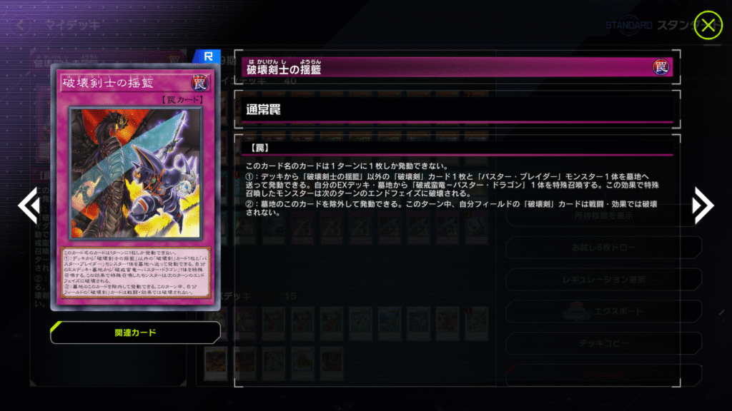 「破壊剣士の揺籃」は1ターンに1枚しか発動できない。①:デッキから「破壊剣士の揺籃」以外の「破壊剣」カード1枚と「バスター・ブレイダー」モンスター1体を墓地へ送って発動できる。自分のエクストラデッキ・墓地から「破戒蛮竜-バスター・ドラゴン」1体を選んで特殊召喚する。この効果で特殊召喚したモンスターは次のターンのエンドフェイズに破壊される。②:墓地のこのカードを除外して発動できる。このターン、自分フィールドの「破壊剣」カードは戦闘・効果では破壊されない。