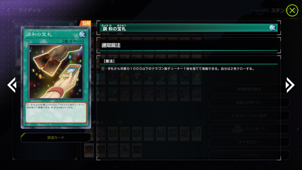 ①:手札から攻撃力1000以下のドラゴン族チューナー1体を捨てて発動できる。自分はデッキから2枚ドローする。