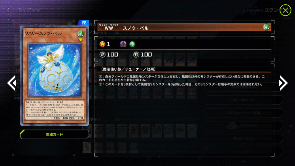 ①:自分フィールドに風属性モンスターが2体以上存在し、風属性以外のモンスターが存在しない場合に発動できる。このカードを手札から特殊召喚する。②:このカードをS素材として風属性SモンスターをS召喚した場合、そのSモンスターは相手の効果では破壊されない。