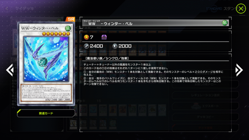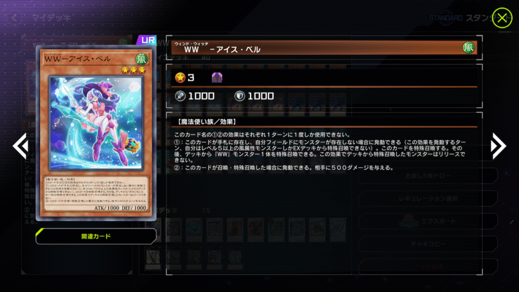 このカード名の①②の効果はそれぞれ1ターンに1度しか使用できない。①:自分フィールドにモンスターが存在しない場合に発動できる。このカードを手札から特殊召喚する。その後、デッキから「WW」モンスター1体を特殊召喚できる。この効果でデッキから特殊召喚したモンスターはリリースできず、この効果を発動するターン、自分はレベル5以上の風属性モンスターしかEXデッキから特殊召喚できない。②:このカードが召喚・特殊召喚に成功した場合に発動できる。相手に500ダメージを与える。