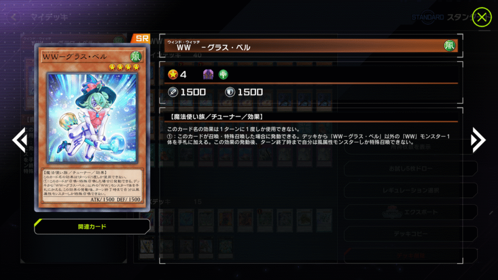 「WW-グラス・ベル」の効果は1ターンに1度しか使用できない。①:このカードが召喚・特殊召喚に成功した場合に発動できる。デッキから「WW-グラス・ベル」以外の「WW」モンスター1体を手札に加える。この効果の発動後、ターン終了時まで自分は風属性モンスターしか特殊召喚できない。