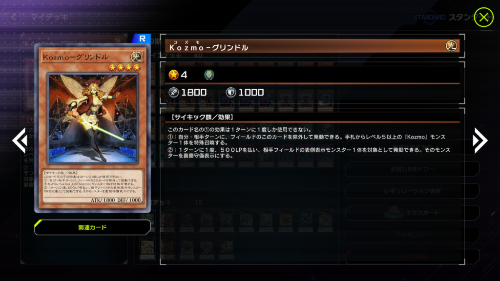 ①:このカードが召喚・特殊召喚に成功した場合、フィールドの魔法・罠カード1枚を対象として発動できる。そのカードを破壊する。②:このカードが戦闘・効果で破壊され墓地へ送られた場合、墓地のこのカードを除外して発動できる。デッキからレベル4以下の「Kozmo」モンスター1体を特殊召喚する。