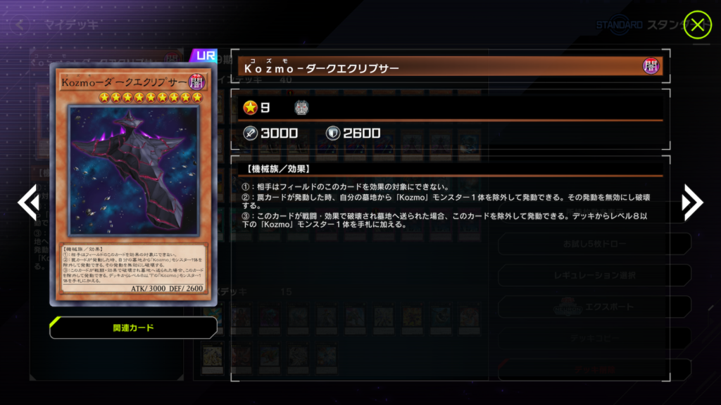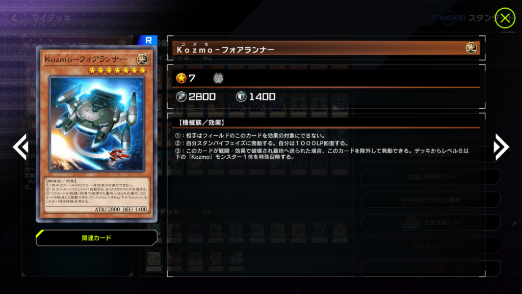 ①:このカードが召喚・特殊召喚に成功した場合、フィールドのモンスター1体を対象として発動できる。そのモンスターを破壊する。②:このカードは相手の効果の対象にならない。③:このカードが戦闘・効果で破壊され墓地へ送られた場合、墓地のこのカードを除外して発動できる。デッキからレベル7以下の「Kozmo」モンスター1体を特殊召喚する。